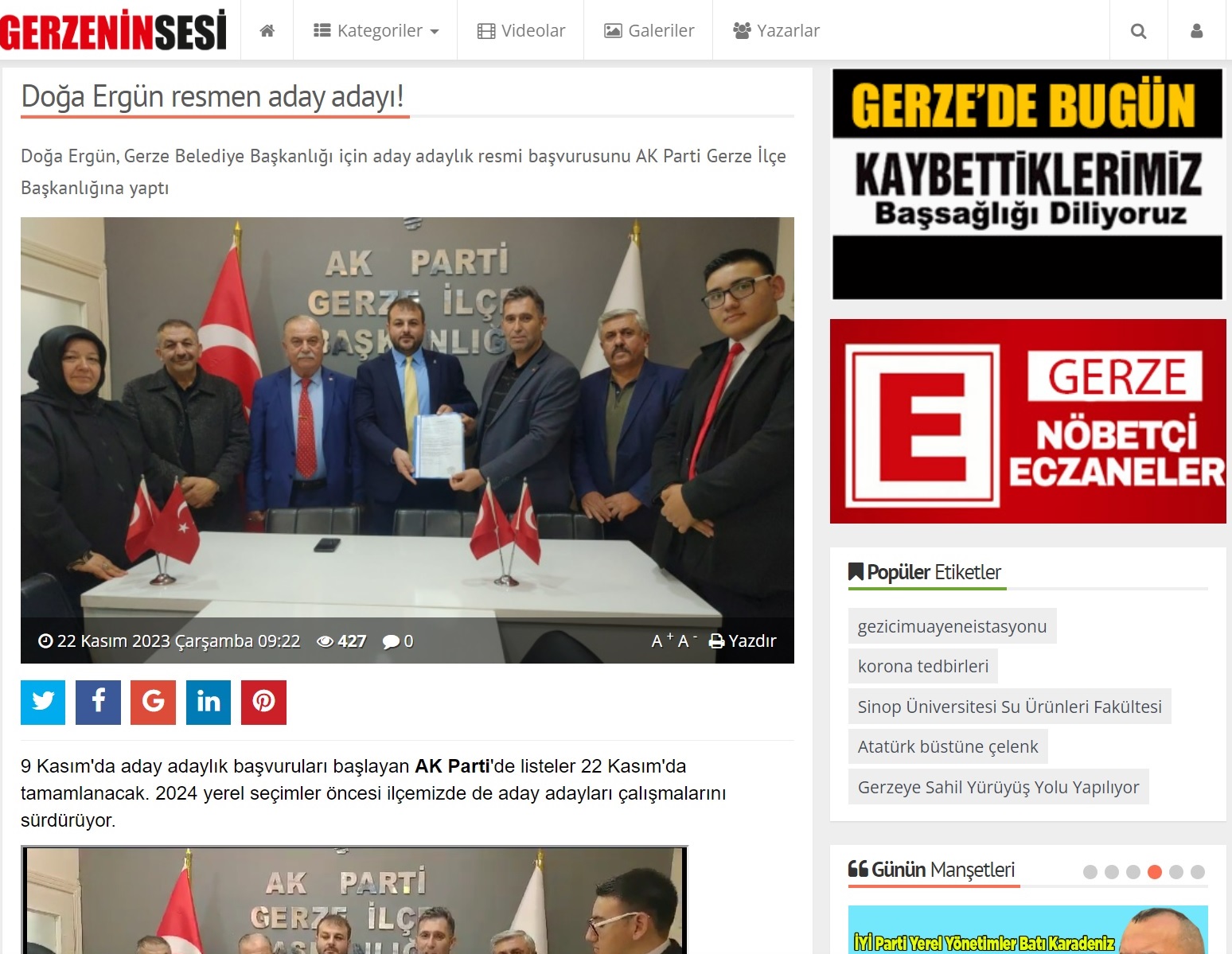 Doga Ergün, Gerze Belediye Baskanligi için aday adaylik resmi basvurusunu AK Parti Gerze Ilçe Baskanligina yapti. Geçtigimiz günlerde AK Parti’den Gerze Belediye Baskanligi için aday adayi olan Doga Ergün, resmi basvurusunu da gerçeklestirdi. Basvurusunun ardindan dosyasini hazirlayan Doga Ergün, parti binasinda aday adayligi dosyasini Ilçe Baskani Cumhur Kurt'a teslim etti.